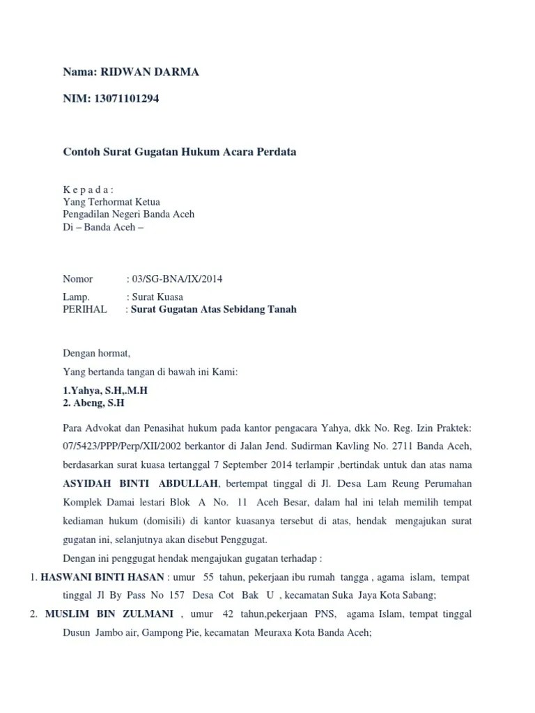 Surat Gugatan Ujian Advokat - Contoh Surat Gugatan Cerai Karena Suami Menikah Lagi - 23 maret 2017 | post by.. Surat kuasa khusus merupakan surat kuasa yang dibuat oleh seseorang atau perusahaan kepada pihak advokat (pengacara) guna menyelesaikan masalah yang terkait dengan pengadilan. English club discussion series 'how to become an international … Adalah layanan bagi pengguna terdaftar untuk pendaftaran perkara secara online, mendapatkan taksiran panjar biaya perkara secara online, pembayaran secara online, pemanggilan … Persyaratan pokok surat kuasa khusus yang dibuat di luar negeri sama yang dibuat di dalam negeri. Untuk pelayanan yang lebih mudah, cepat dan biaya ringan, ditjen badan peradilan agama menyediakan layanan pembuatan gugatan / permohonan secara mandiri.